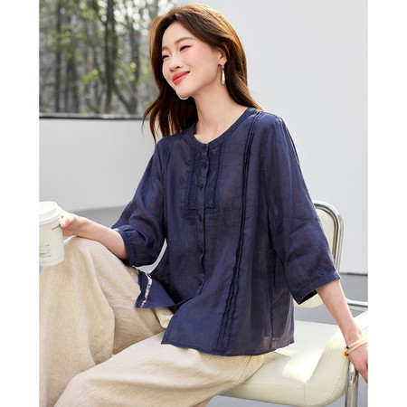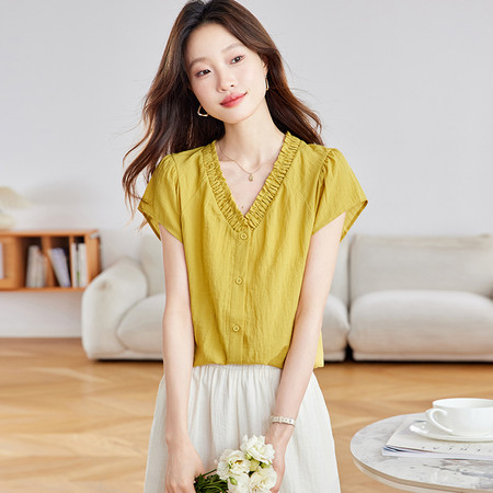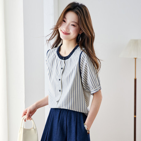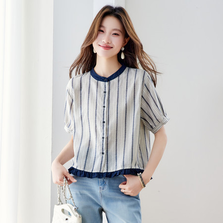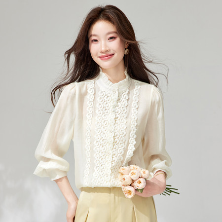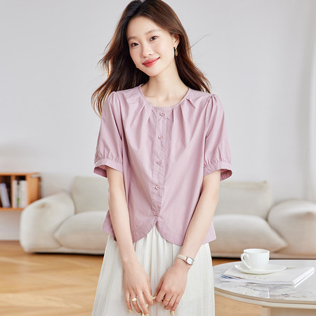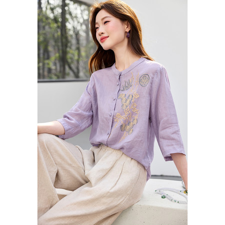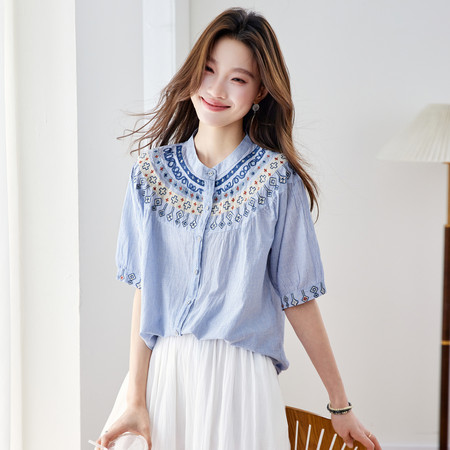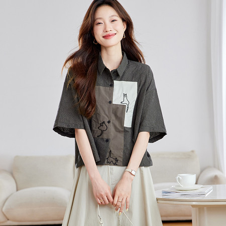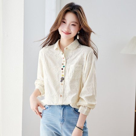 翻领刺绣气质纯棉衬衫女短款春装新款休闲风宽松衬衣简约通勤
