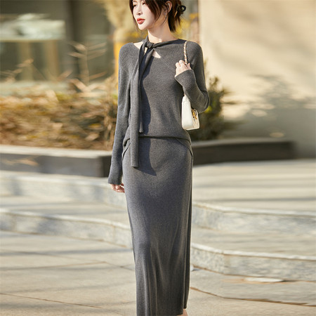 时尚腰链流苏慵懒风套装2026春装大码胖MM上衣+半身裙女针织两件套