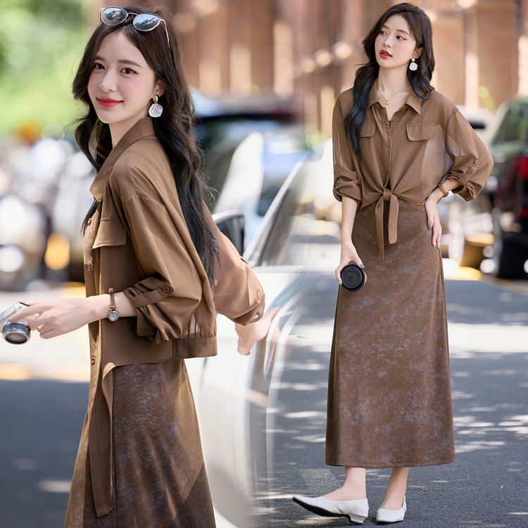夏秋新款两件套裙吊带连衣裙长袖衬衣套装裙