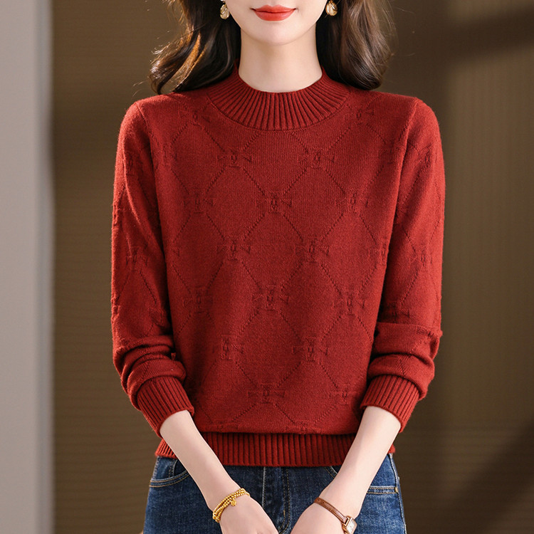 原创时尚气质半高领洋气减龄内搭女秋冬加厚菱形纹理针织衫宽松上衣女