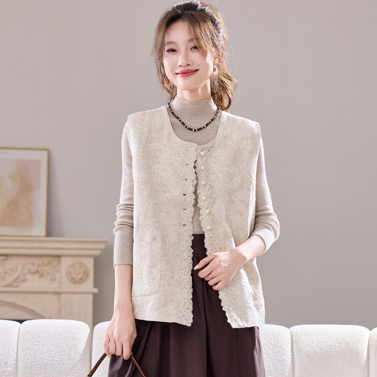 2025新款重工亚麻刺绣蕾丝门襟马甲