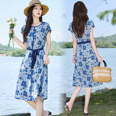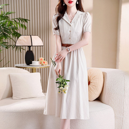 高腰条纹纯棉短袖连衣裙女夏季新款气质优雅收腰显瘦过膝裙子