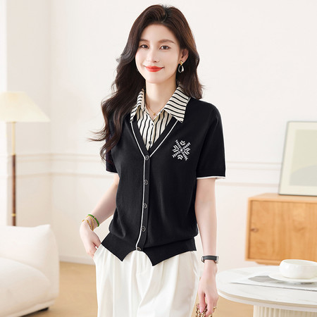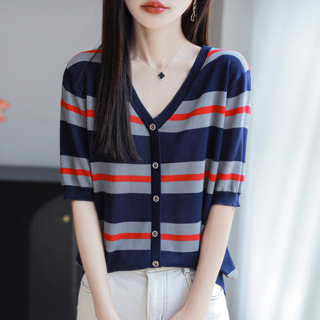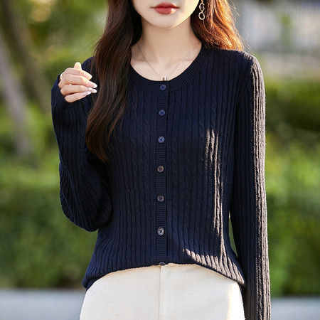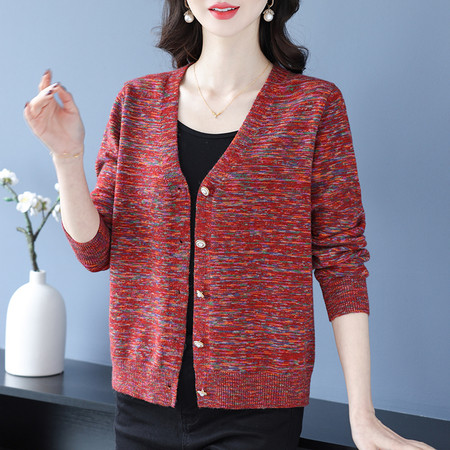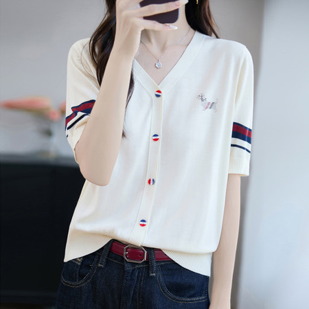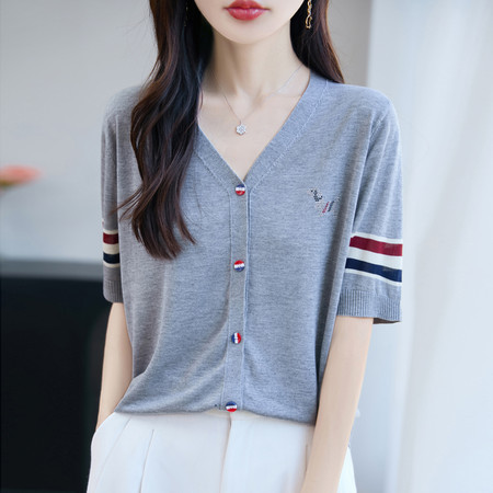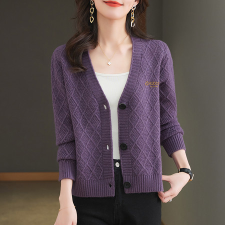 春秋款薄款针织衫开衫上衣短款 有弹力V领单排扣百搭休闲纯色提花设计女装