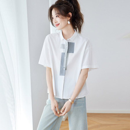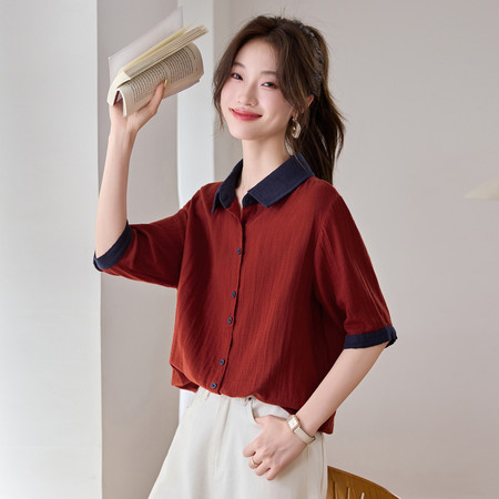 短袖纯棉衬衫女2025夏季新款宽松翻领上衣减龄显瘦薄款衬衣