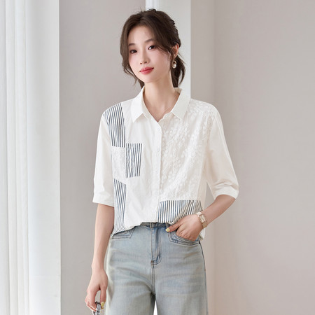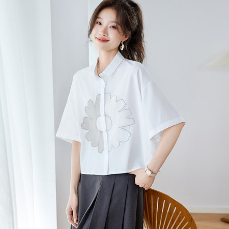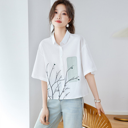 短袖纯棉衬衫女2025夏季新款宽松翻领上衣减龄显瘦薄款刺绣衬衣